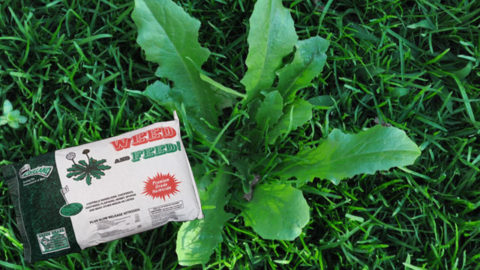 Since we can’t prevent these weeds from coming up, we need to control them with a post-emergent called WEED and FEED. Post-emergent is a fancy way to say that the weeds need to be big enough to make them an easy target for the granular WEED and FEED to stick to their leaves. This professional strength broadleaf weed herbicide plus turf food is applied anytime between April and June as needed. Apply on a sunny day when temperatures are above 65°, on a wet lawn or a morning dew so the granular product sticks to the leaves. Do not apply if rain is expected within 48 hours and no mowing 48 hours before or after application.