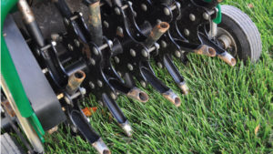 Core aerators are heavy machines that pull cores or plugs from the soil. The benefits of core aeration are to reduce the bulk density of the soil and improve gas exchange and water infiltration, which in turn benefits nutrient uptake and strengthens the root system of your grass. Homeowners with thick turf, poor drainage, or heavy soil compaction will benefit from hollow tine core aeration. Core aerators are not the best tool for overseeding, but they are the best method to improve soil conditions to help the grass grow.