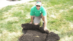 Identification of grub damage can be tricky as it occurs when lawns can be stressed by summer drought or lawn disease. The best way to check for grub damage is to grab a handful of the affected turf and gently tug. The grass will peel back like a carpet, exposing the grubs that have eaten the roots. Grubs are often discovered after the turf has been disturbed by foraging skunks and raccoons.